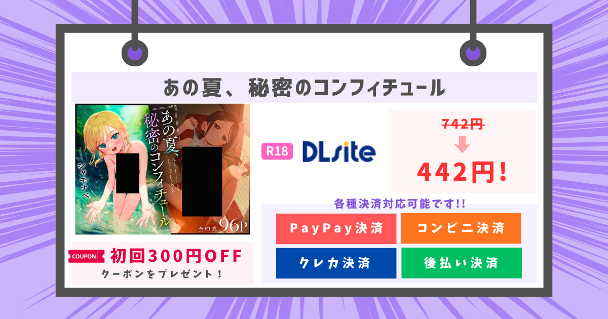 あの夏、秘密のコンフィチュールを安心して楽しむなら、DLsiteでの購入一択です。DLsiteは20年以上運営されている国内最大級の電子書籍・同人作品販売サイトで、信頼性は抜群。しかも、お得なクーポン制度や試し読みが充実しています。