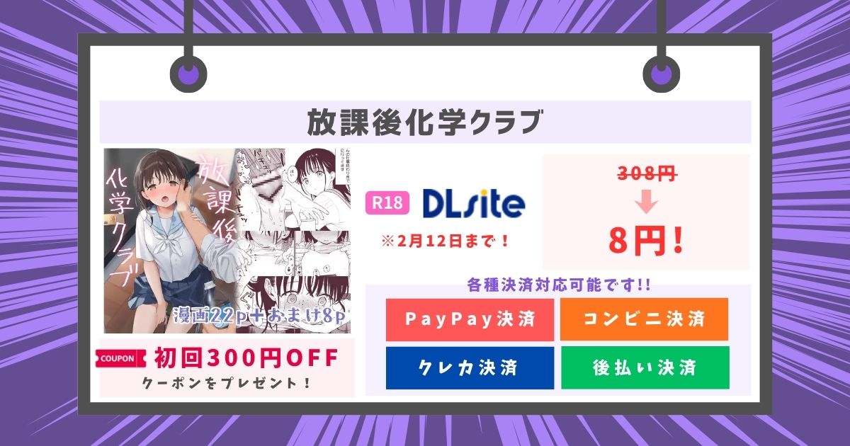 『放課後化学クラブ』を安心して楽しむなら、DLsiteでの購入一択です。DLsiteは20年以上運営されている国内最大級の電子書籍・同人作品販売サイトで、信頼性は抜群。しかも、お得なクーポン制度や試し読みが充実しています。