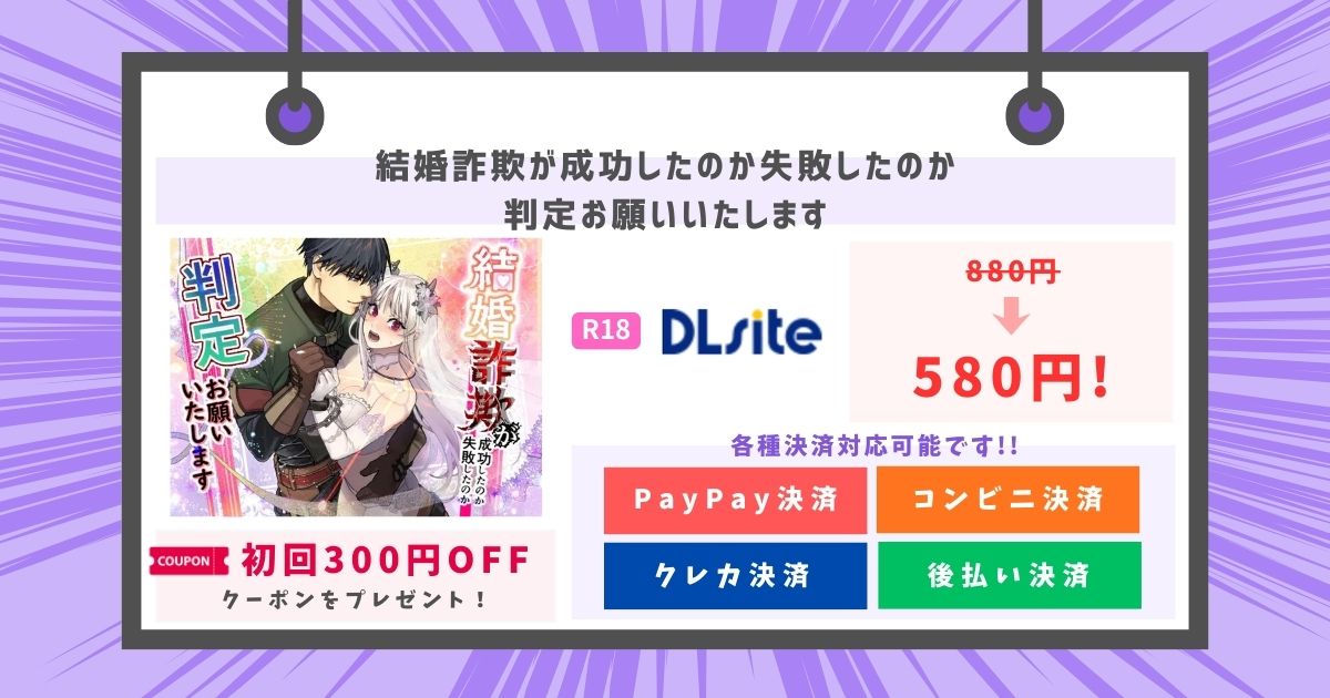 『結婚詐欺が成功したのか失敗したのか判定お願いいたします』を安心して楽しむなら、DLsiteでの購入一択です。DLsiteは20年以上運営されている国内最大級の電子書籍・同人作品販売サイトで、信頼性は抜群。しかも、お得なクーポン制度や試し読みが充実しています。