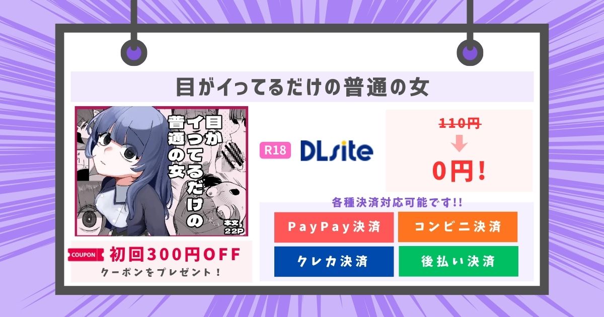 『目がイってるだけの普通の女』を安心して楽しむなら、DLsiteでの購入一択です。DLsiteは20年以上運営されている国内最大級の電子書籍・同人作品販売サイトで、信頼性は抜群。しかも、お得なクーポン制度や試し読みが充実しています。