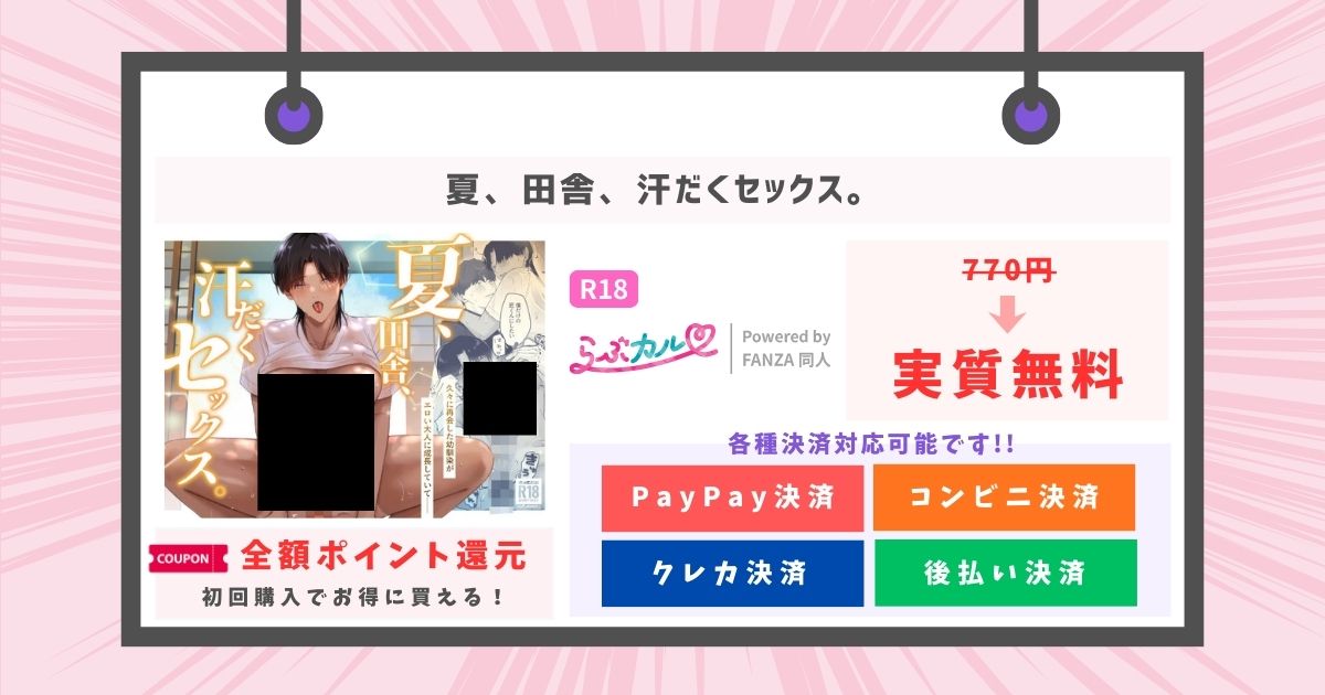 夏、田舎、汗だくセックス。を安心して楽しむなら、らぶカルでの購入一択です。らぶカルは国内最大級の電子書籍・同人作品販売サイトFANZAの姉妹サイトで、信頼性は抜群。しかも、お得なクーポン制度や試し読みが充実しています。
