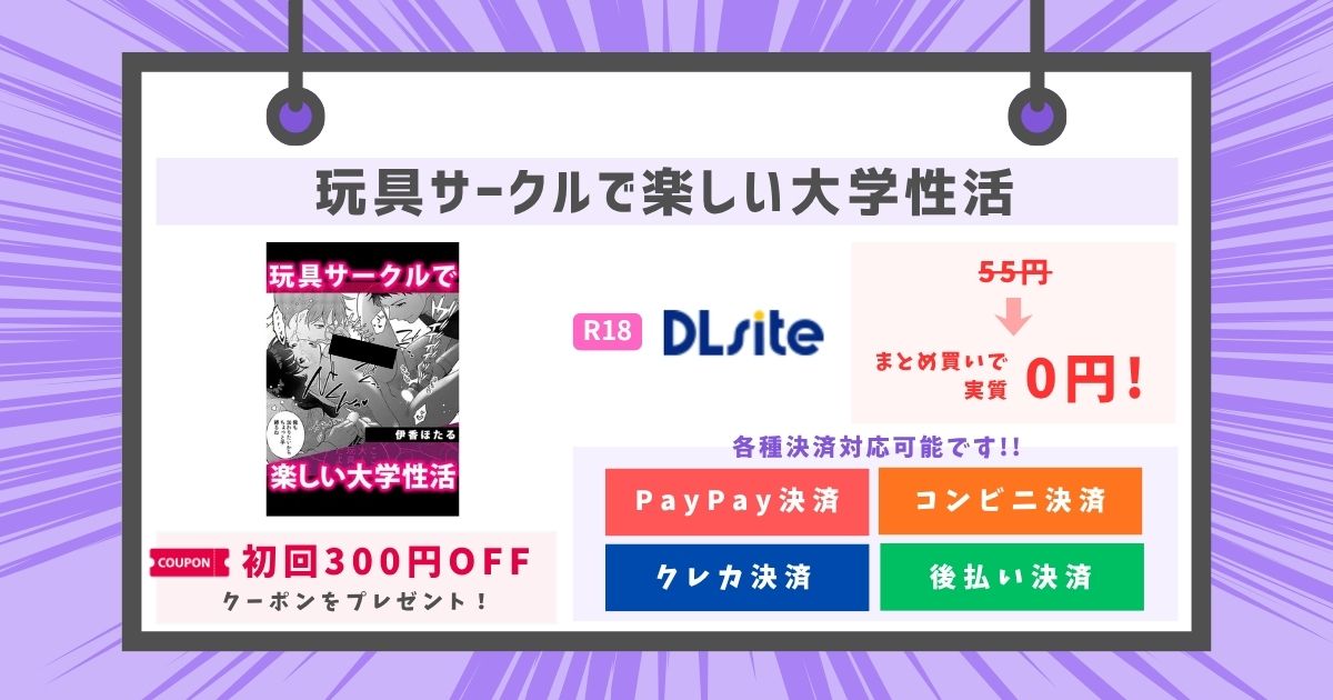 『玩具サークルで楽しい大学性活』を安心して楽しむなら、DLsiteでの購入一択です。DLsiteは20年以上運営されている国内最大級の電子書籍・同人作品販売サイトで、信頼性は抜群。しかも、お得なクーポン制度や試し読みが充実しています。