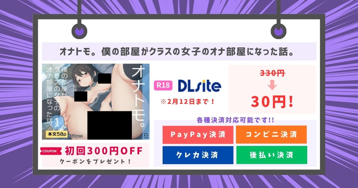 『オナトモ。 僕の部屋がクラスの女子のオナ部屋になった話。』を安心して楽しむなら、DLsiteでの購入一択です。DLsiteは20年以上運営されている国内最大級の電子書籍・同人作品販売サイトで、信頼性は抜群。しかも、お得なクーポン制度や試し読みが充実しています。