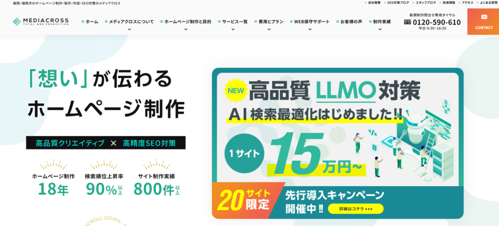 福岡市を拠点に、10年で600件以上のホームページ制作実績を持つ会社です。WordPressを活用し、SEOに強いホームページの制作を得意としています。
